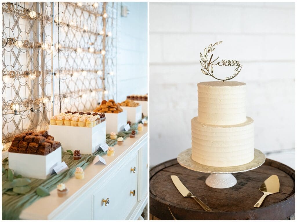 As the evening began, guests gathered for the reception. The space was decorated in beautiful forest green and gold. The cake table lined the back wall and was filled with so many delicious treats. The wooden head table sat in the center of the room and looked incredible.